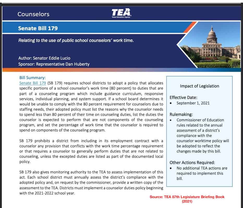 - Require school counselors to spend at least 80 percent of their time on counseling duties as specified in the legislation and TEA rule, or document why the district can’t meet that requirement.
