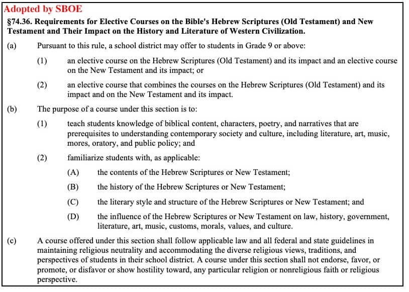 Although the SBOE has not formally adopted a TEKS specific curriculum on this topic, the board (several years ago) approved requirements for ISDs and charters to follow if they choose to offer the course in grades 9 or above — or to incorporate the specific religious literature topics into other courses.